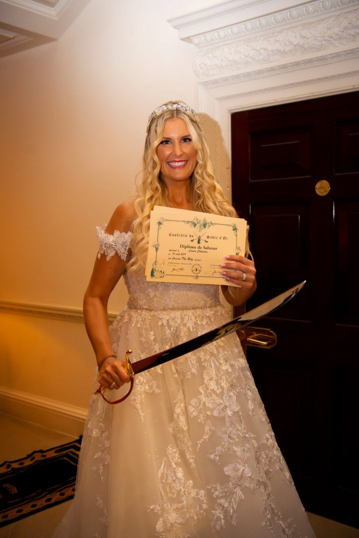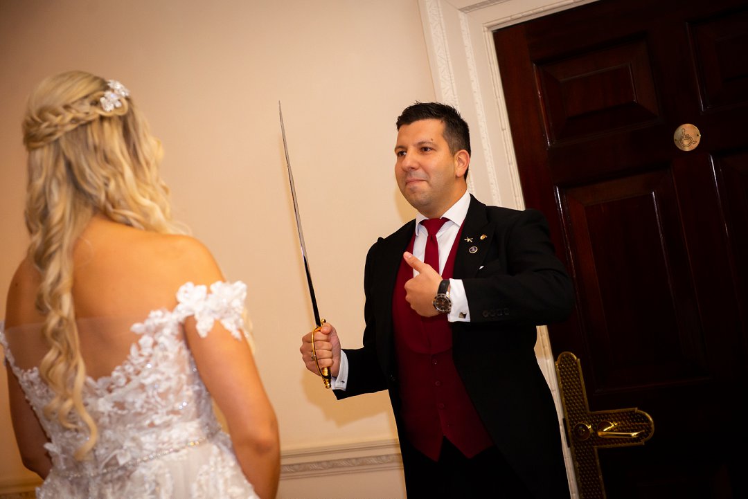 Once the drinks reception had started, and guests were mingling, the couple made their entrance together down the grand staircase. They then each opened bottles of champagne with a sword and the help of The Ritz’s wine sommelier (it’s a fun and daring French technique called sabrage).