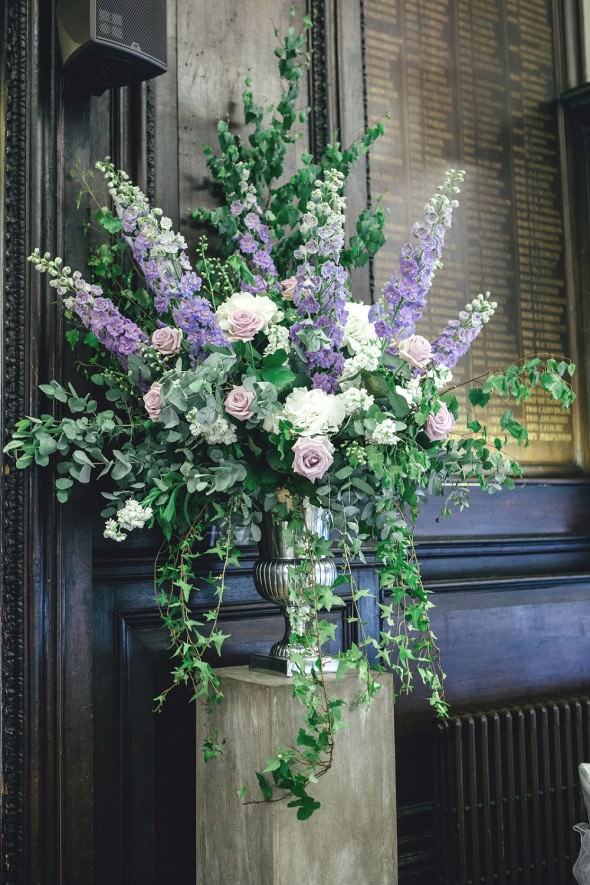 The great hall at Stationers Hall is fabulous space but Rosie was concerned about it being dark with its heavy wood tables and chairs so we went with lots of light flowers and white linen to help brighten the space and the pretty stationery by Hello Lucky! added subtle hints of pale pink to complement the grey table runners.