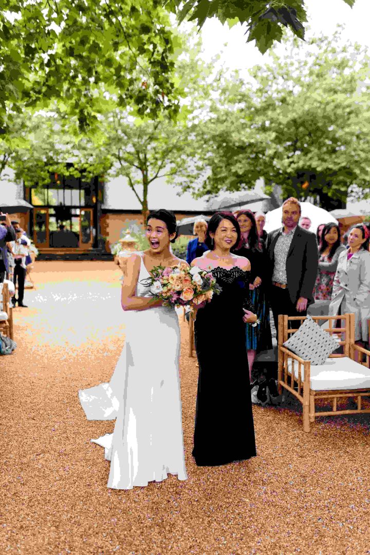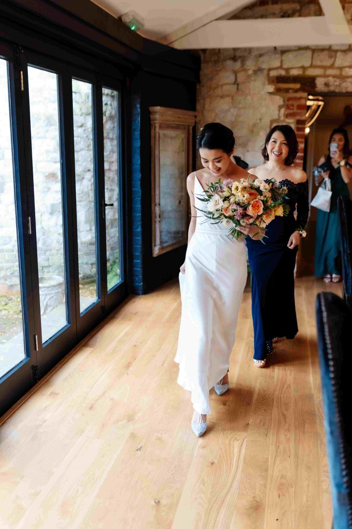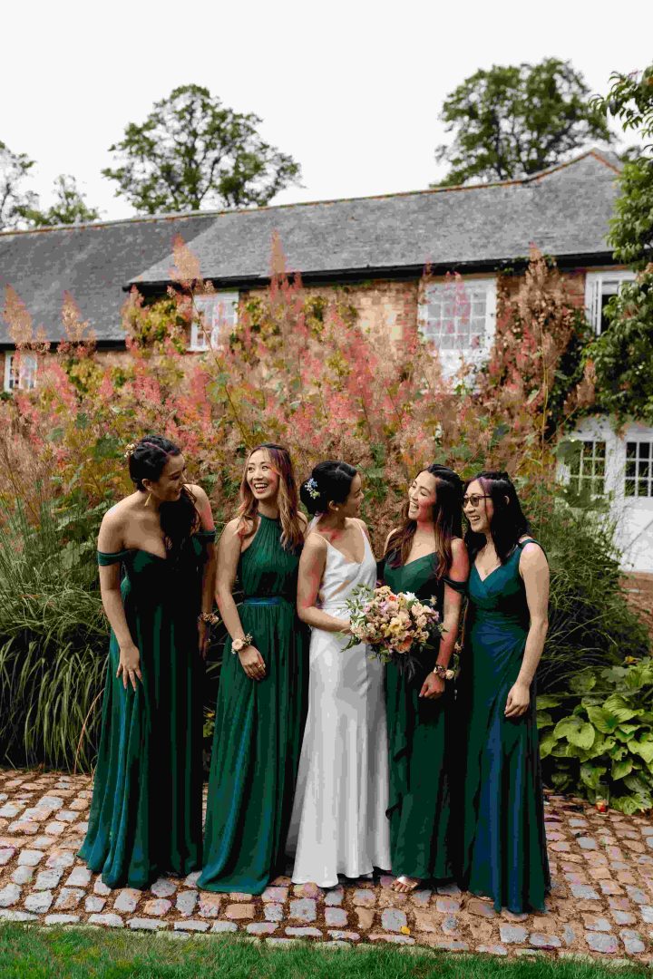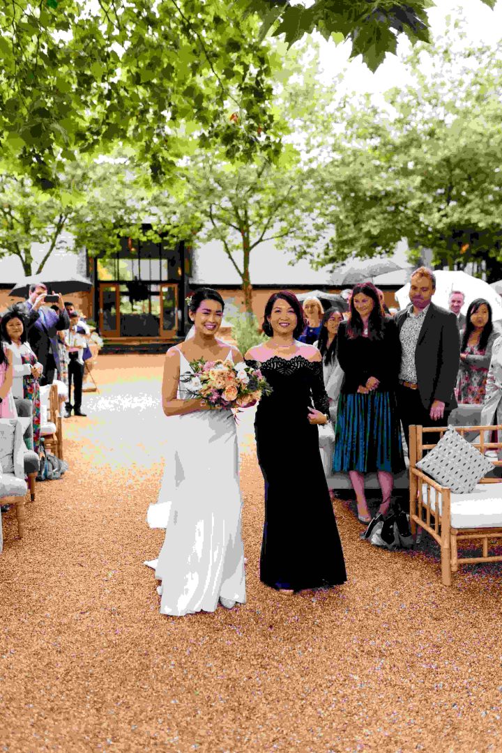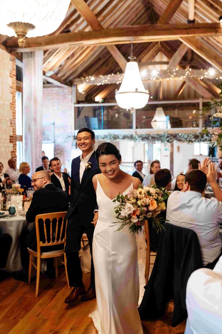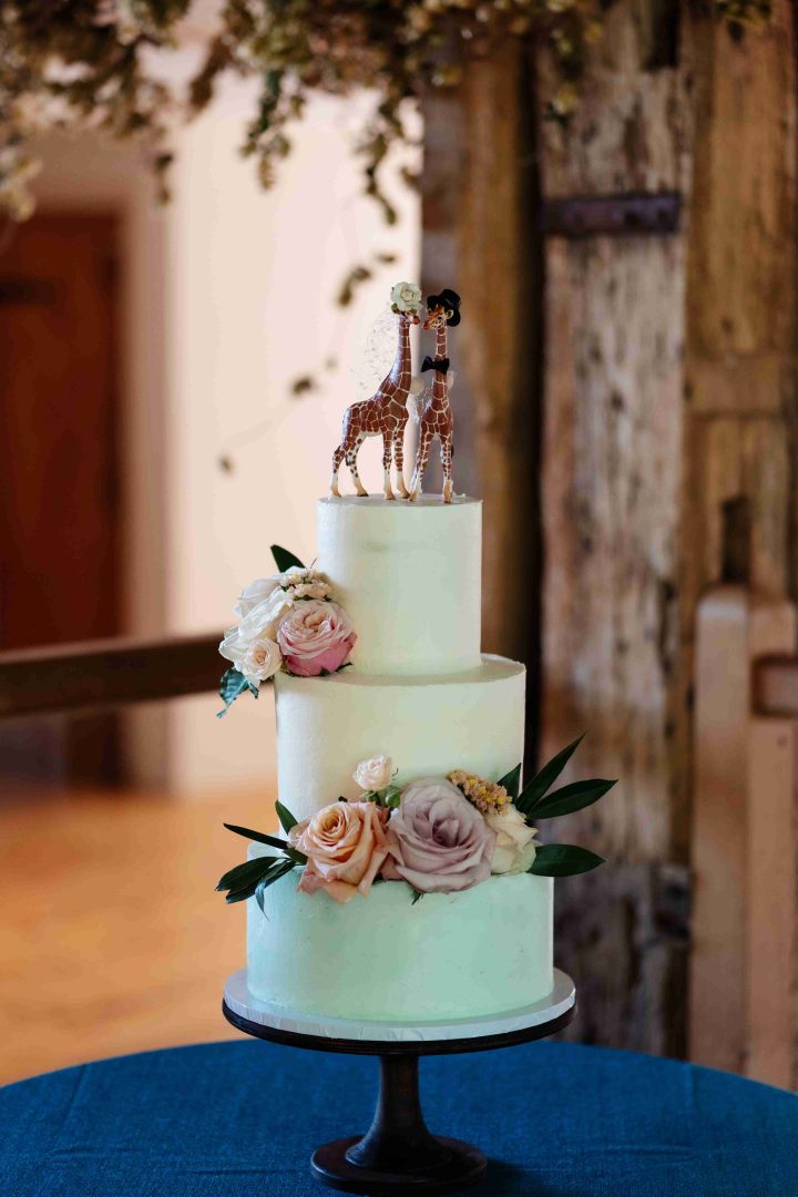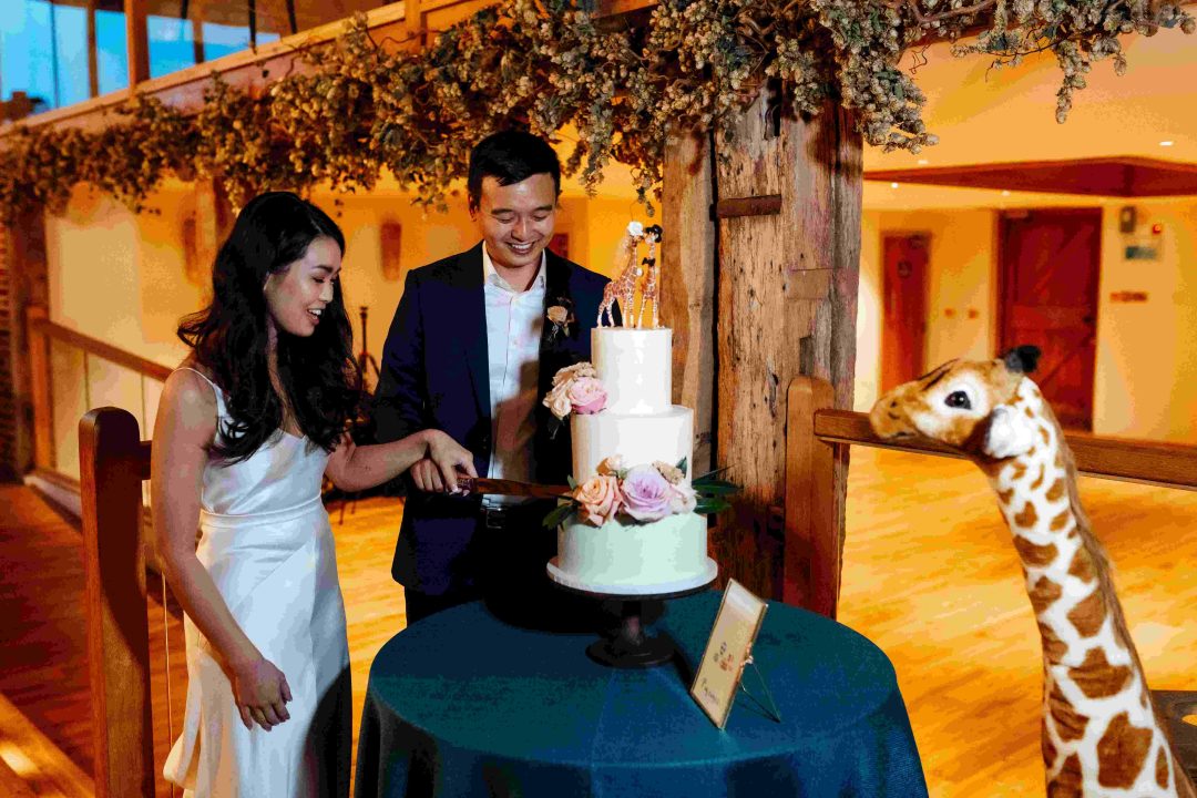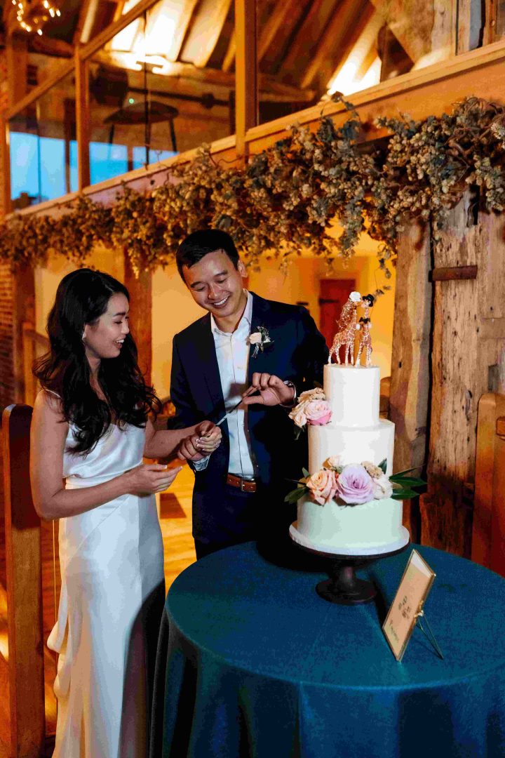 This was a joyous and unique celebration of their love, held at the Bury Court Barn with outdoor areas, landscaped walled garden, Italian-inspired courtyard, and on-site accommodation for guests. The day began with a traditional Chinese Tea ceremony and despite British summertime weather, the couple went ahead with their outdoor ceremony plans, decorated with an elegant deconstructed arch in shades of white with pops of apricot. The wedding showcased their love story through unique details, such as hand-painted stationery pieces and table names illustrated after key events in their lives and relationship. The wedding featured an elegant buttercream cake adorned with fresh flowers and giraffe toppers, delicious cocktails and food, a photobooth, outdoor fire pits, and a tao bun food truck. The couple’s joy was evident on their faces as they danced together, surrounded by family and friends