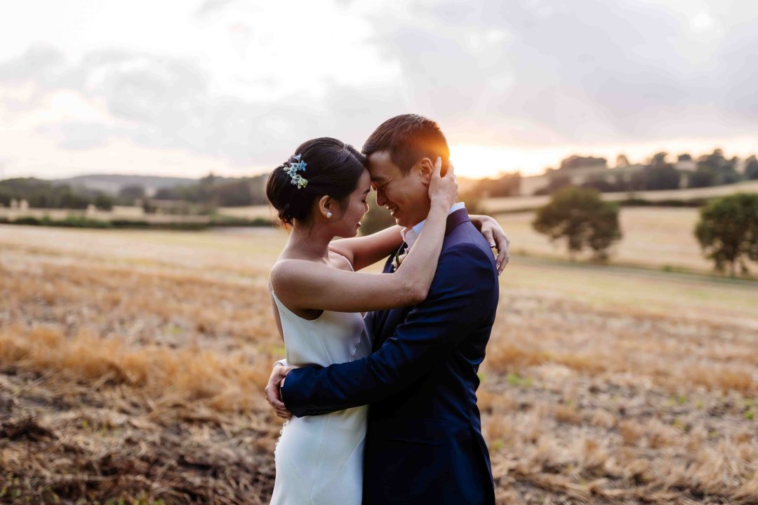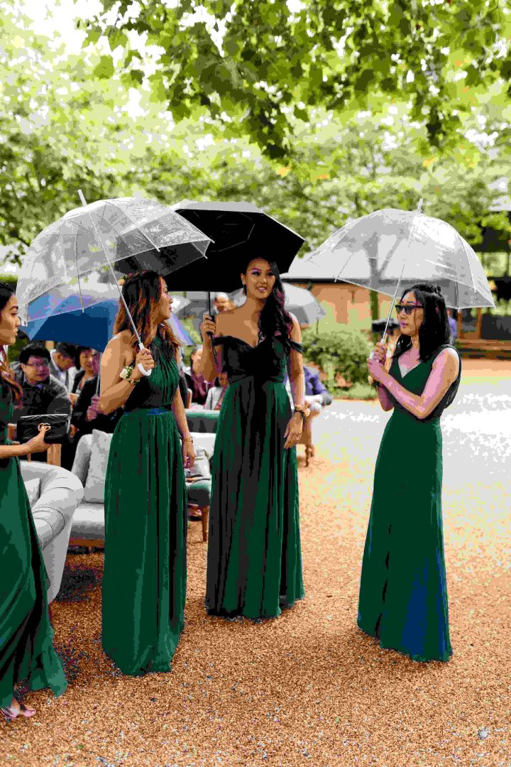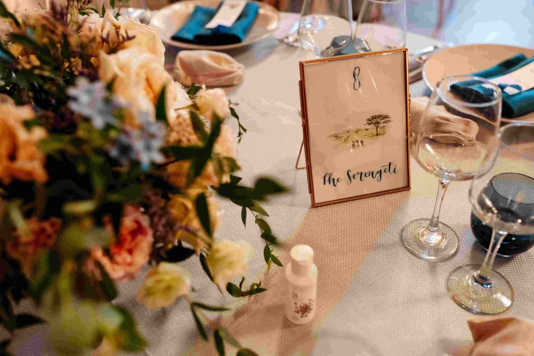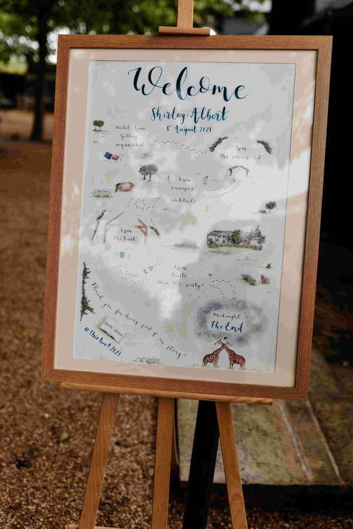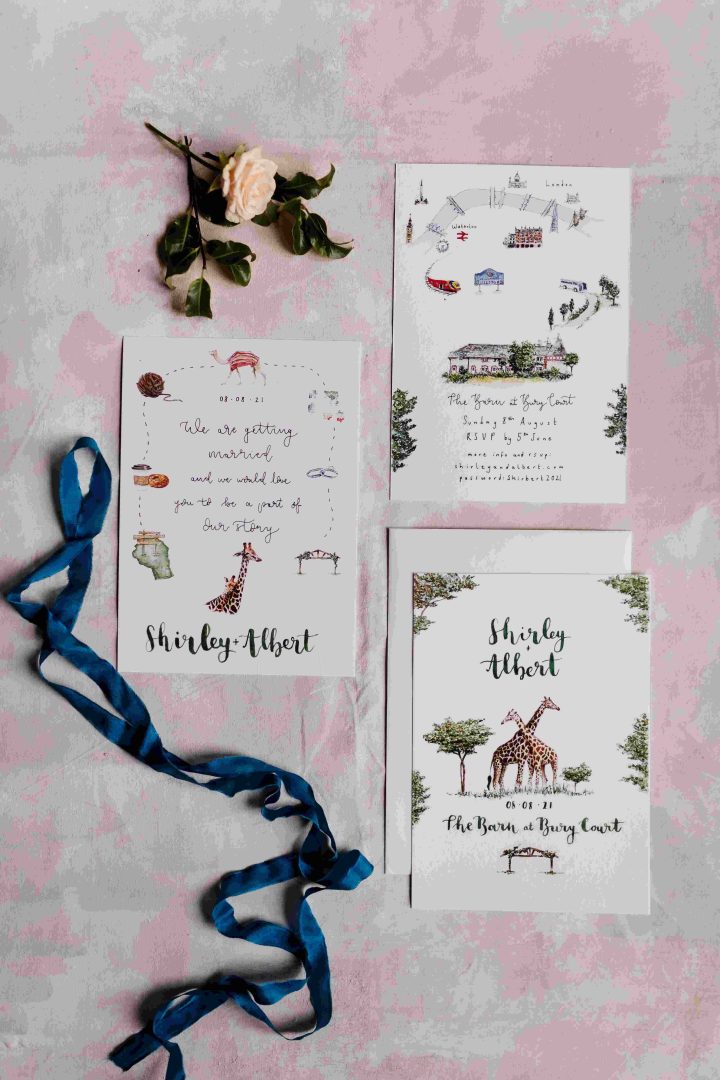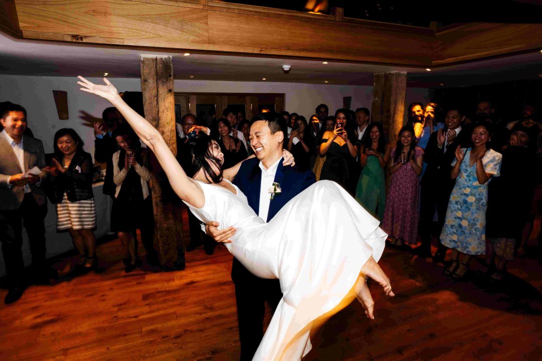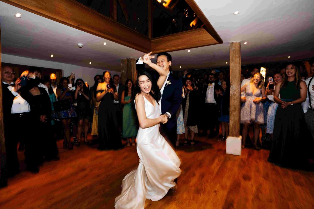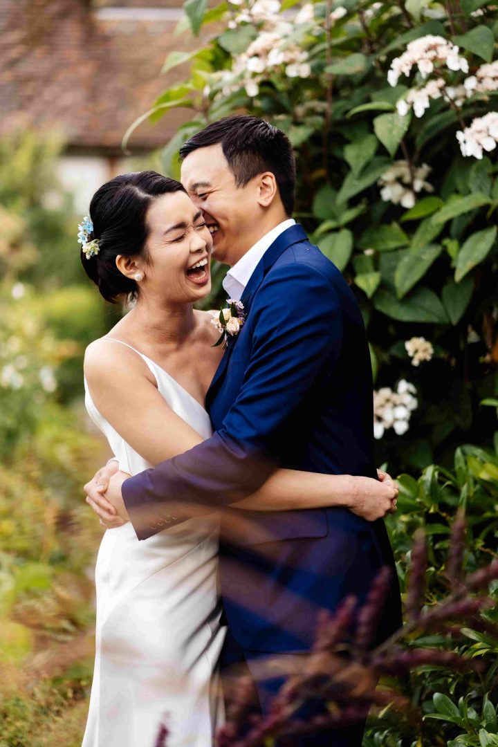 This was a joyous and unique celebration of their love, held at the Bury Court Barn with outdoor areas, landscaped walled garden, Italian-inspired courtyard, and on-site accommodation for guests. The day began with a traditional Chinese Tea ceremony and despite British summertime weather, the couple went ahead with their outdoor ceremony plans, decorated with an elegant deconstructed arch in shades of white with pops of apricot. The wedding showcased their love story through unique details, such as hand-painted stationery pieces and table names illustrated after key events in their lives and relationship. The wedding featured an elegant buttercream cake adorned with fresh flowers and giraffe toppers, delicious cocktails and food, a photobooth, outdoor fire pits, and a tao bun food truck. The couple’s joy was evident on their faces as they danced together, surrounded by family and friends