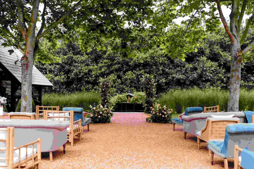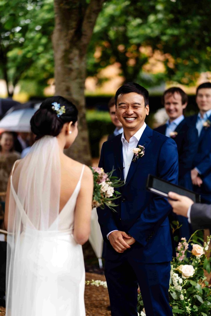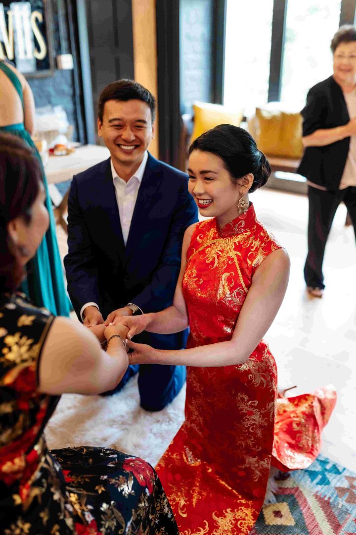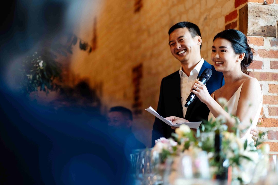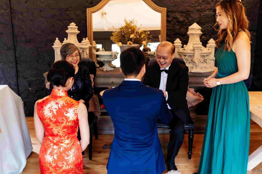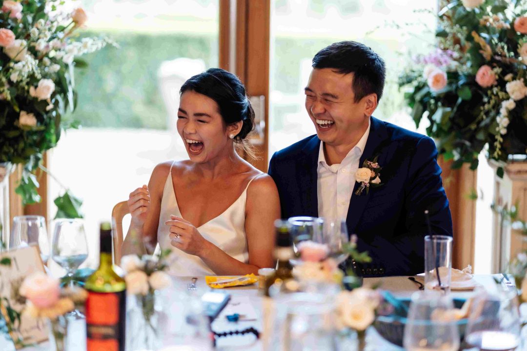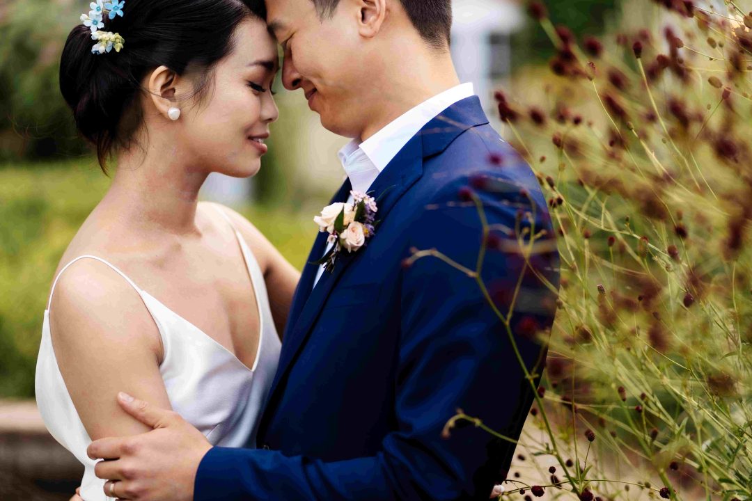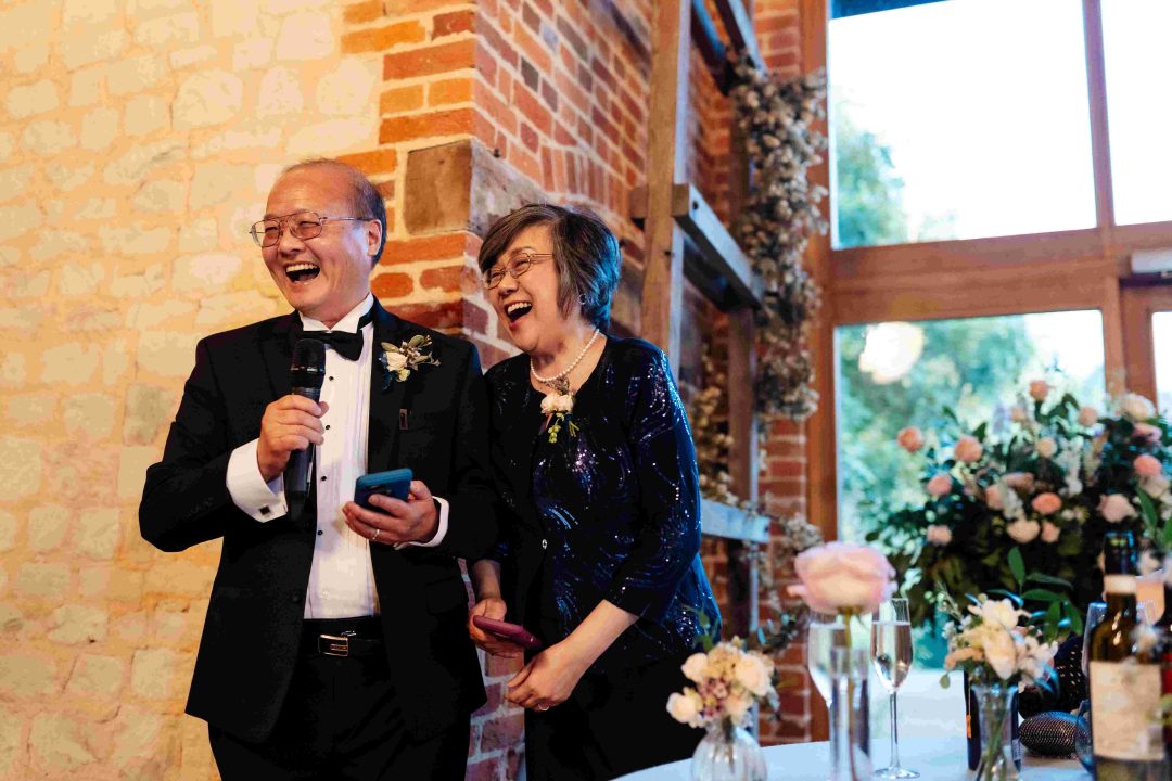 This was a joyous and unique celebration of their love, held at the Bury Court Barn with outdoor areas, landscaped walled garden, Italian-inspired courtyard, and on-site accommodation for guests. The day began with a traditional Chinese Tea ceremony and despite British summertime weather, the couple went ahead with their outdoor ceremony plans, decorated with an elegant deconstructed arch in shades of white with pops of apricot. The wedding showcased their love story through unique details, such as hand-painted stationery pieces and table names illustrated after key events in their lives and relationship. The wedding featured an elegant buttercream cake adorned with fresh flowers and giraffe toppers, delicious cocktails and food, a photobooth, outdoor fire pits, and a tao bun food truck. The couple’s joy was evident on their faces as they danced together, surrounded by family and friends